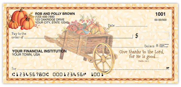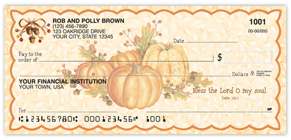 In everything give thanks! Introducing new Autumn Blessings by Karla Dornacher. These Harvest themed checks are a beautiful reminder to count your blessings every day. 4 rotating scenes depict charming images of Autumn's bounty. Each check is thoughtfully paired with a Scripture of praise.
