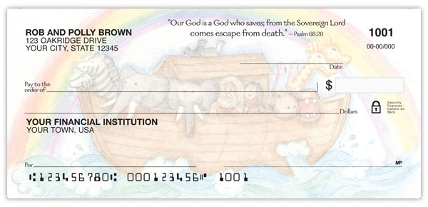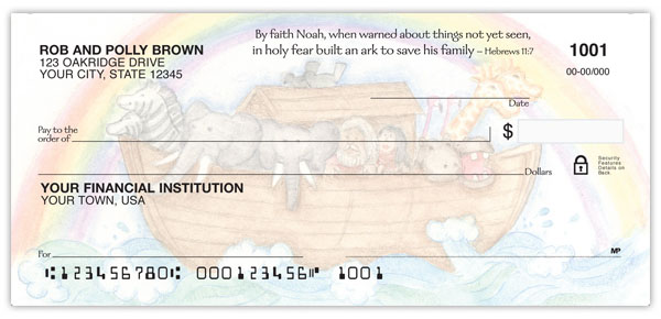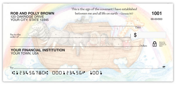 Buy Noah's Ark Checks and share God's covenant with others. These adorable watercolor checks depicting animal pairs, Noah's family and God's rainbow of promise also offer 4 rotating Scriptures.