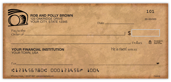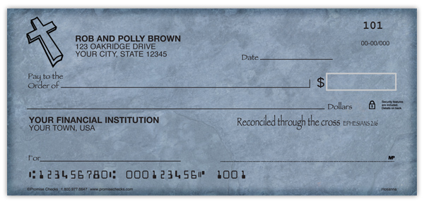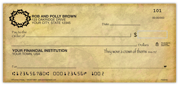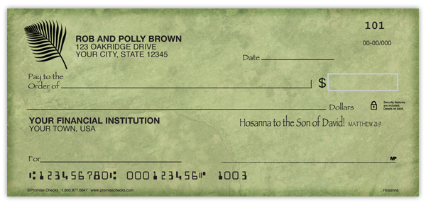 Shout Hosanna to the highest with this iconic new series! This dramatic design, exclusive to Promise Checks, portrays the powerful images of a cross, crown of thorns, palm branch and empty tomb. Four rotating verses and subtle backgrounds are combined with beloved symbols of faith in this classic series. Order Hosanna checks and make an impact for Christ.